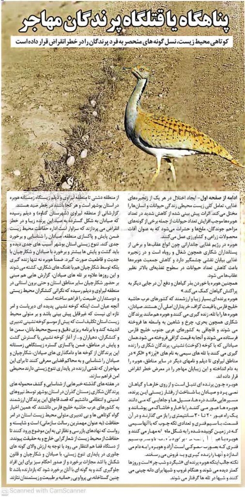 از منطقه دشتی تا منطقه لیراوی و دیلم زیستگاه زمستانه هوبره در استان بوشهر است و هر کجا باشند در خطر صید هستند.