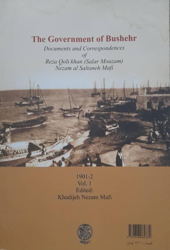 دوره دو جلدی «حکومت بوشهر» به همت و تلاش بانو خدیجه نظاممافی در دو جلد مصور، در قطع رقعی و به تیراژ هزار نسخه در سال ۱۳۹۰، توسط انتشارات نشر تاریخ ایران در تهران منتشر شده است. این کتاب همراه با مجوزهای چاپ و نشر از جمله شابک و شماره کتابشناسی ملی، ثبت در ردهبندیهای کنگره و دیویی، فهرستنویسی برابر «فیپا»، طراحی روی جلد و صفحهآرایی مناسب، ارائه شده و حاوی اسناد و مدارک جالب و اطلاعات مفید تاریخی در حوزه بوشهرشناسی و بوشهرپژوهی است.